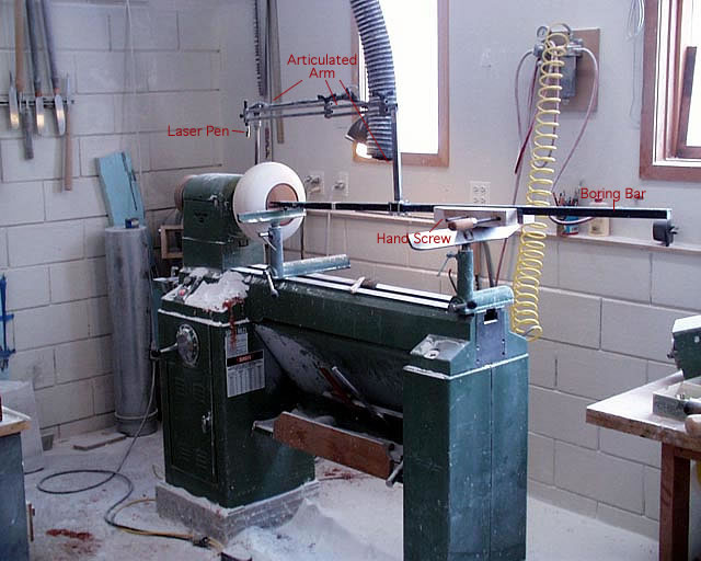 Figures #4 and #5 show an overall view of the set up. The boring bar is about five feet long. I use two tool rests for support and a wooden hand screw style clamp on the bar to keep it from rolling.