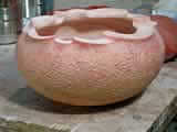 Here's a quick history of my progress in carving. The first piece was Vessel #649 (the wavy band around the middle is paint, not wood). It was an acceptable but confusing start. Then I took another rough turned piece and used modeling clay to try to better understand and visualize my intended end result. The beading work on the clay turned out to be much more trouble than I had anticipated so I tried texturing the piece with a die grinder. The texture didn't show up much until I applied some paint (Interference Red, Vessel #650). With Vessel #655 I dropped the texture and emphasized the painting. I still have wood rims on these pieces, soon after I left the rim off and carved the piece all the way around to the inside (Vessel #658). I have certainly not abandoned the idea of wood rims on carved pieces. Vessels #670 and #671 have wood rims and either raised (#670) or incised (#671) lines. With Vessel #676 incised lines start at the base of the piece and become the edges of shapes at the rim. The interior of #676 is textured.
