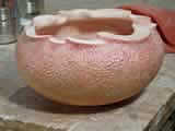 Figure 1 shows a rough turned block of alabaster on a faceplate, if you are not sure about getting to this point go to Part 1 of the basic turning tutorial. For this piece I am going to carve the rim and texture the outside. In figure 2, I have defined the area to be carved by hollowing out the center and delineating the carved, versus the turned, portion to the bowl. The pencil line on the top is an outline for the inner edge of the rim. The next step (figure 3) is to open up the rim by cutting to this line with an extra-coarse (black) Kutzall burr. Figure 4 shows this step completed.