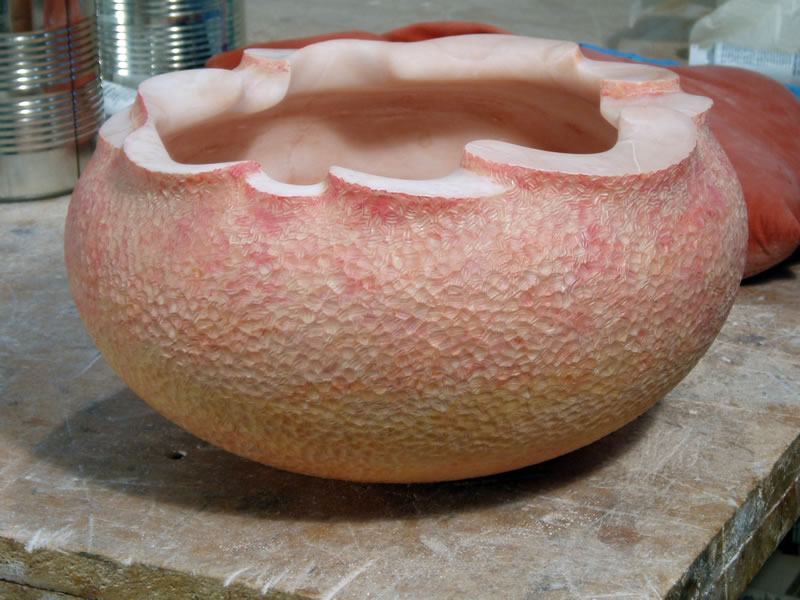 When I first thought about combining carving with turning on my alabaster pieces I was worried. So much has been done in this area with wood that I was afraid of stepping on some one's toes, or looking like a derivative of someone else's work. After carefully looking at the work being done in wood I didn't see anything that looked quite like what I was thinking about. So, I decided to plunge in and start carving. The irony here is that what I ended up with wasn't much like the shape I originally had in mind. I realize now that I didn't have a very clear understanding of three dimensional shape to start with. Another great discovery was that alabaster is a superb carving medium, no real surprise here, that's what most of it is sold for. It just took me 18 years of working with it to make that discovery for myself. So, if you've been holding back, just get a few tools and start. Like it or not, you will most likely have an original piece in the end.